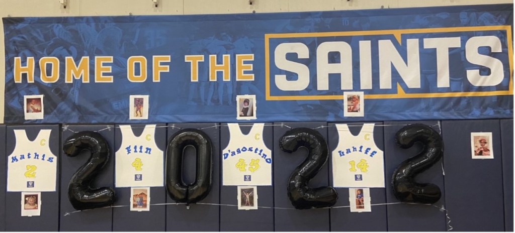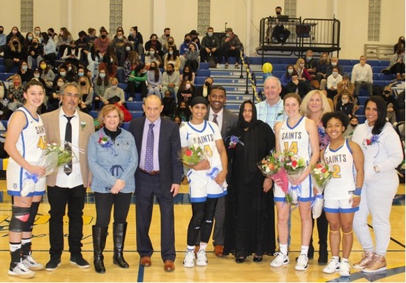 The Emmanuel College Women’s Basketball team faced off against the Coast Guard Academy Bears at home at 7:00PM on Monday, February 7th. The game was Senior Night for the Saints to honor the four graduating Captains, as well as Emily Anderson, a senior on the Dance Team. Prior to the start of the game, all five were commemorated for their accomplishments. They each walked to center court with their parents, where they received flowers and had their picture taken. The basketball players got an embrace from head coach Andy Yosinoff. Photos were taken of the individual, their relatives, and the coach, as well as a group photo of everybody (shown below).