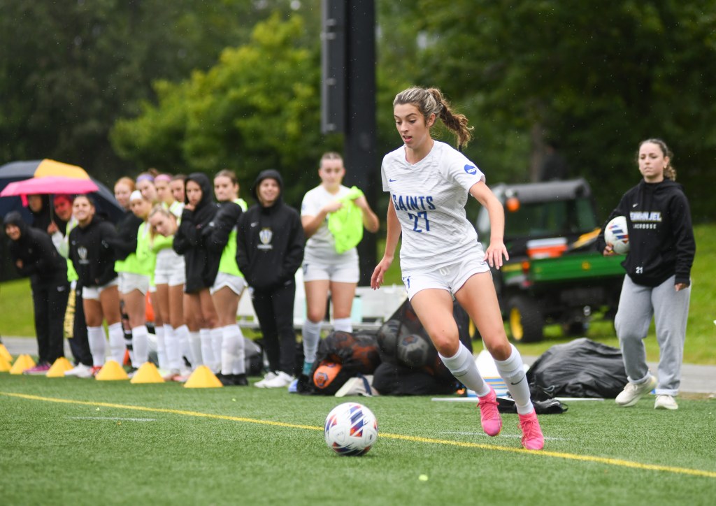 Lily Tobin (#4) looks to dish the ball to a Saints teammate.