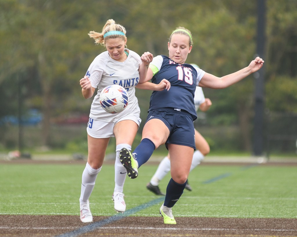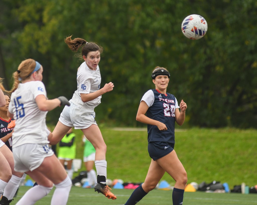Dullaghan hits a header into New England College’s net.