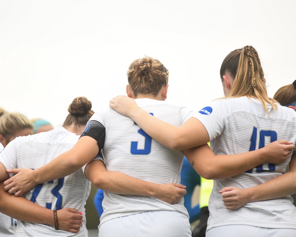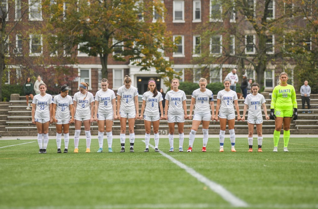 Catherine Manning (#3) embraces teammates Lauren Miley (#10) and Kaelyn Briscoe (#23) in a Saints’ team huddle.
