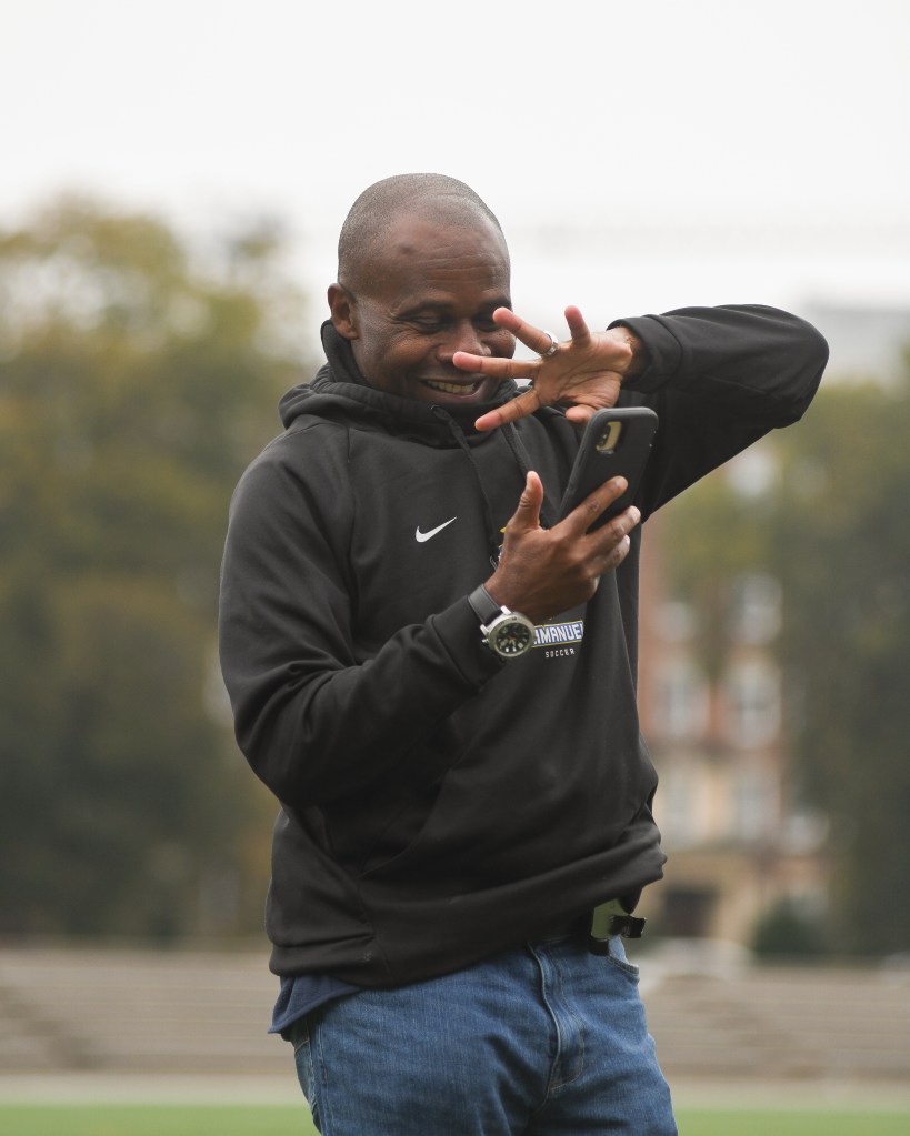 Head coach Francis Okaroh shows off the team’s 4-1 win over New England College.