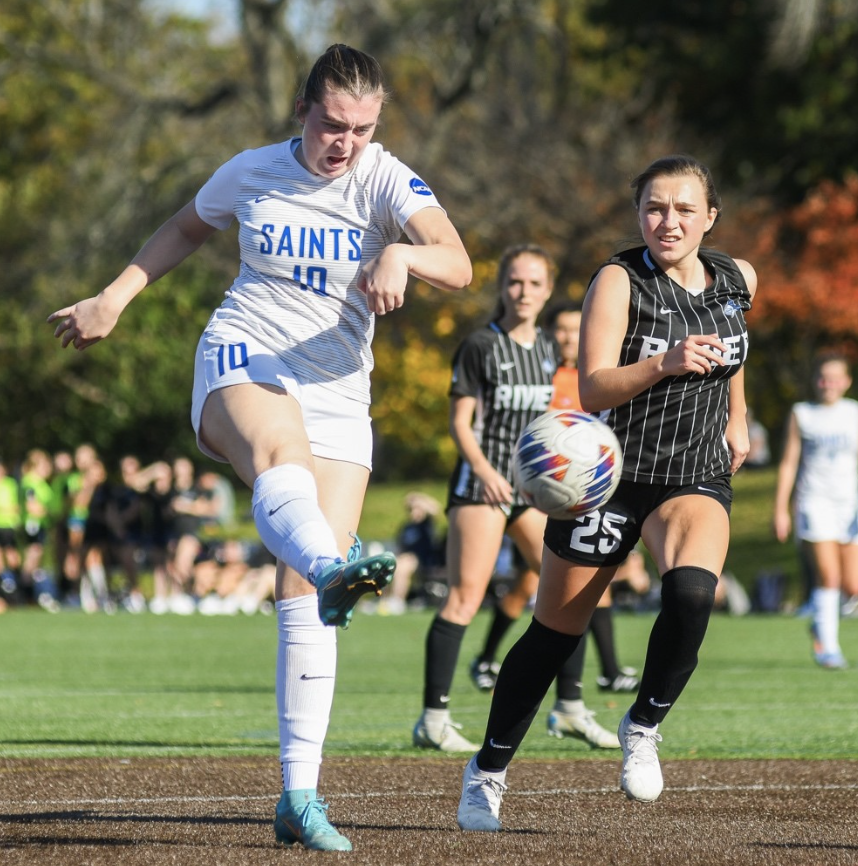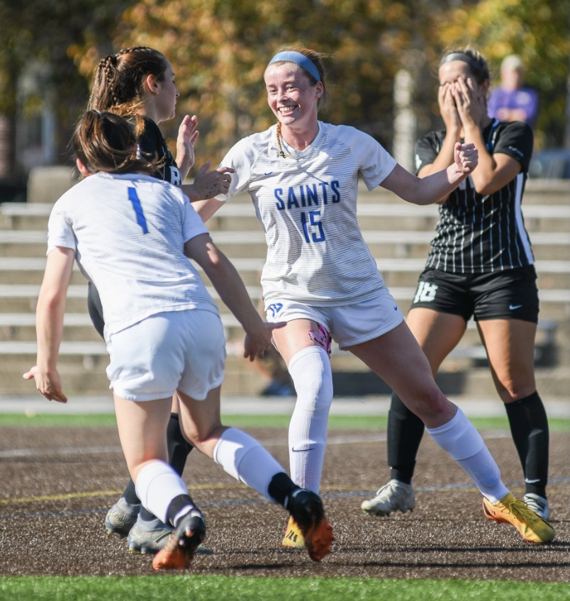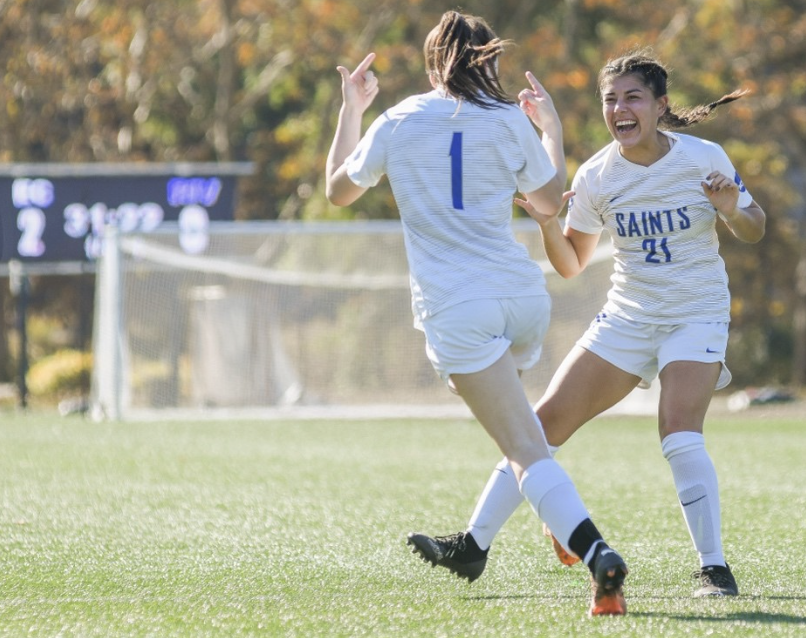 Sarah Dullaghan (#1) and Maya Daryanani (#21) celebrate Dullaghan’s first goal of the game putting the Saints up three.