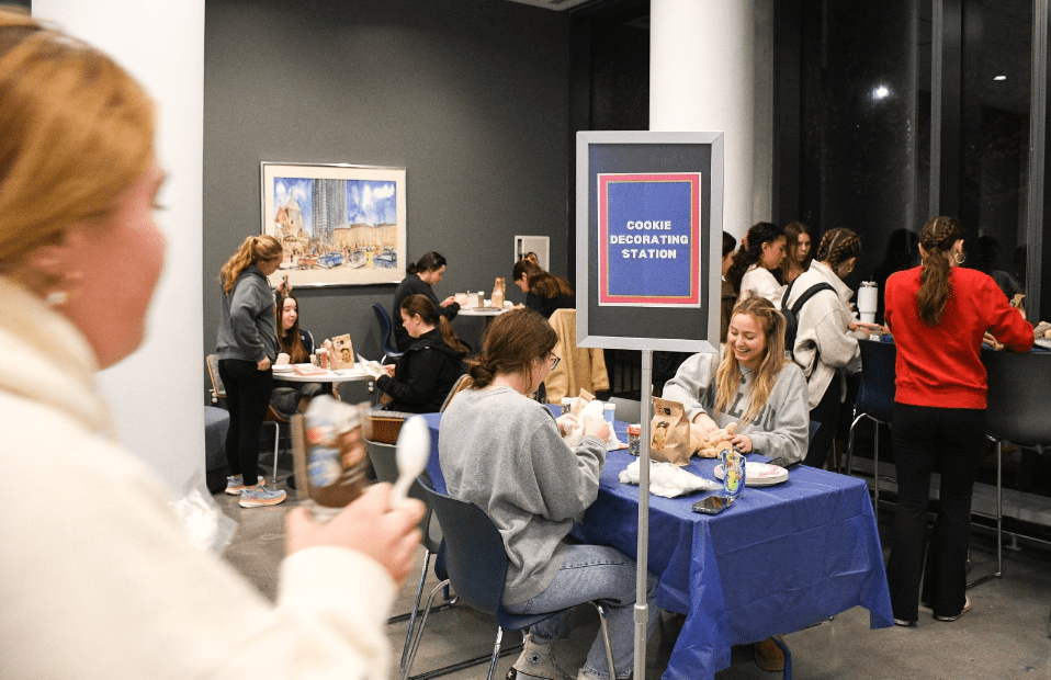 Students enjoy the cookie decoration station with the plushie that was given out.