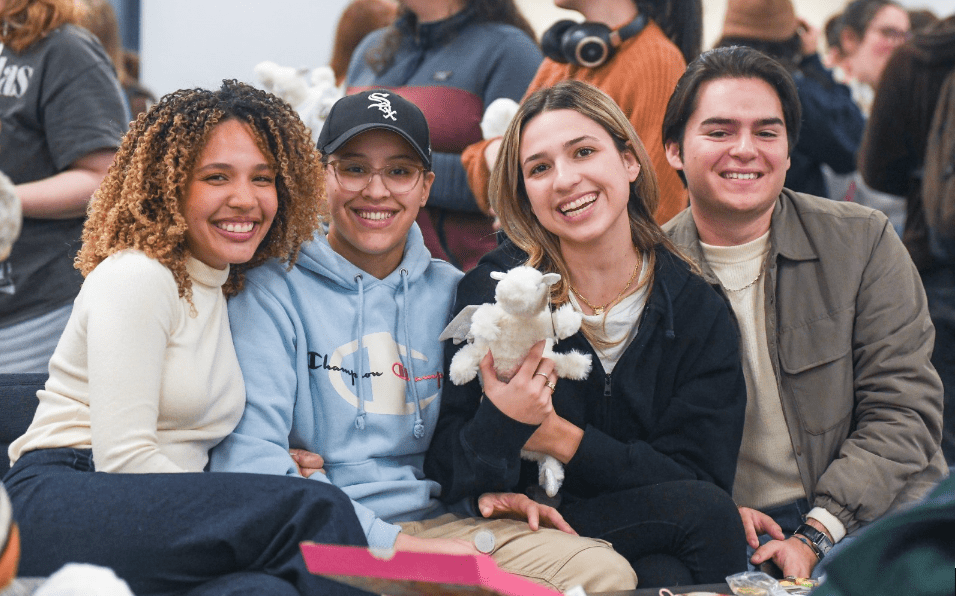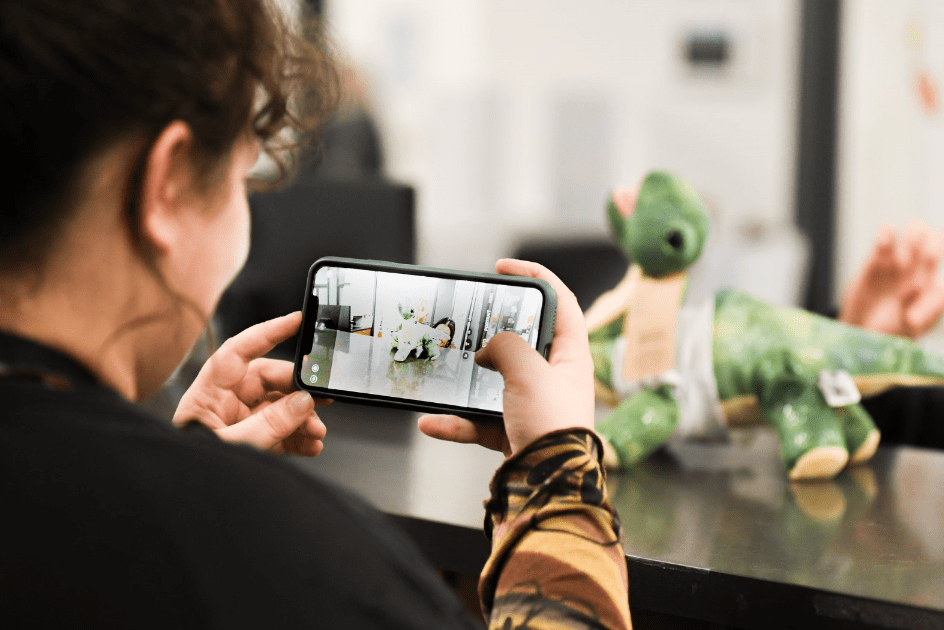A student shows off her dinosaur plushie while taking a picture.