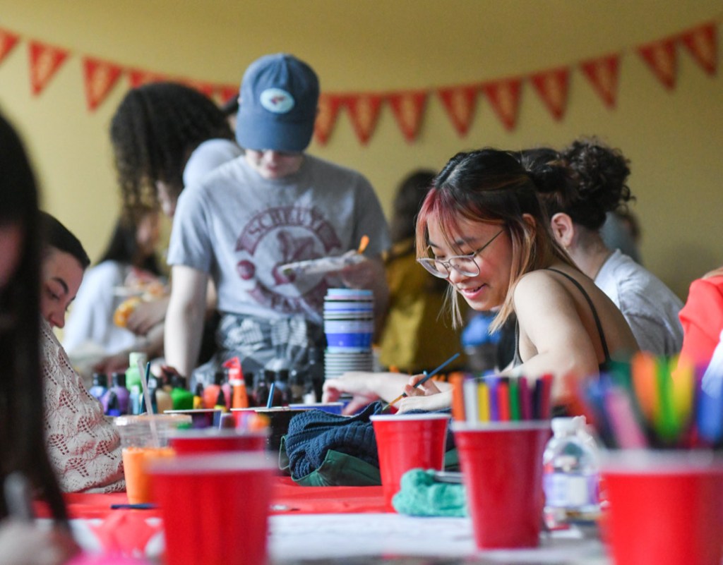 A student smiles at the image she paints with friends